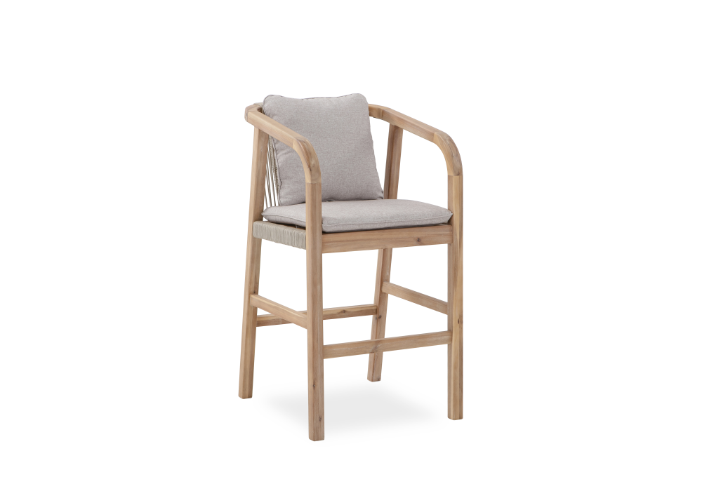 Constructed from sustainable Acacia Timber, known for its remarkable strength and weather-resistant properties, this bar chair is designed to withstand the elements while retaining its natural charm. The seat cushion covers are made from Olefin, a durable synthetic fiber that enhances comfort and ensures long-lasting use.