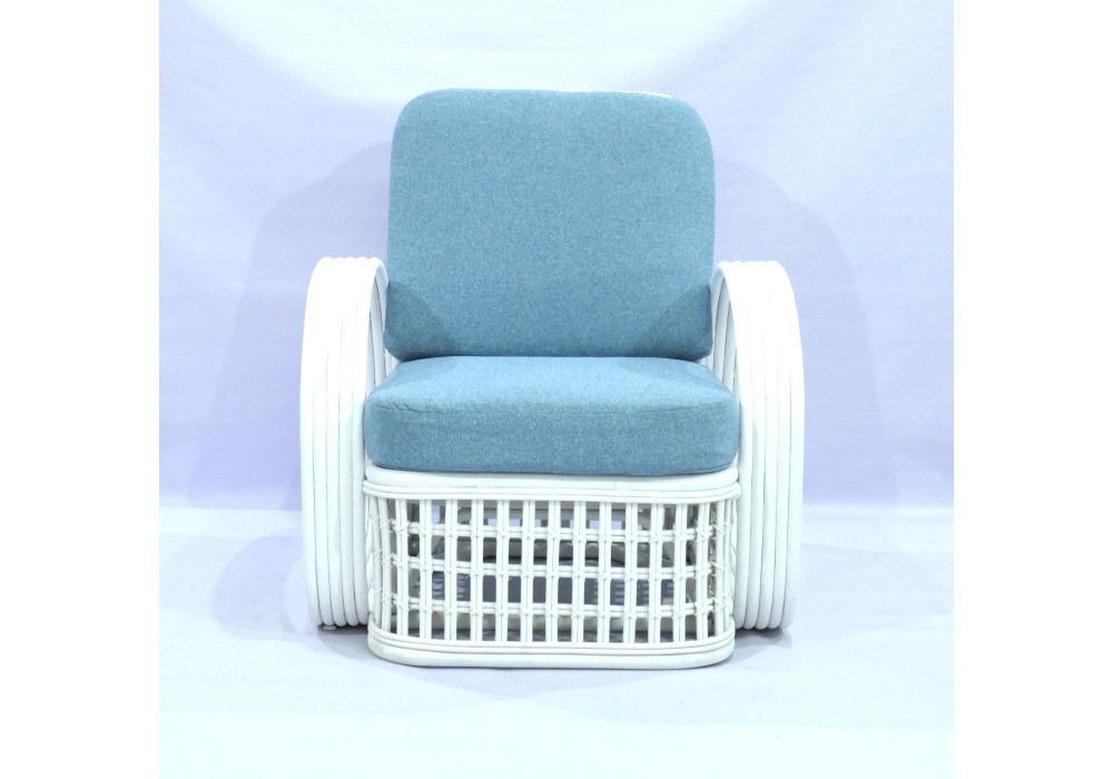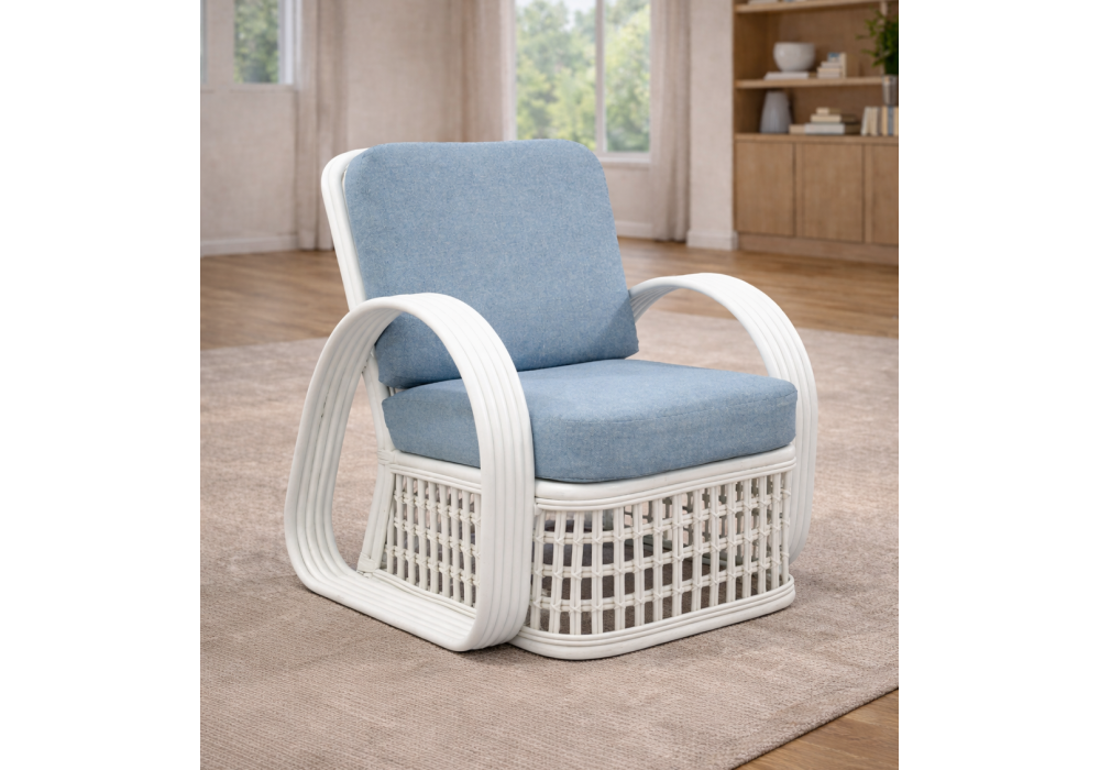 Featuring a beautifully curved rattan frame in a crisp solid white finish, this chair combines relaxed coastal charm with timeless design while the plush, supportive cushion ensures lasting comfort.