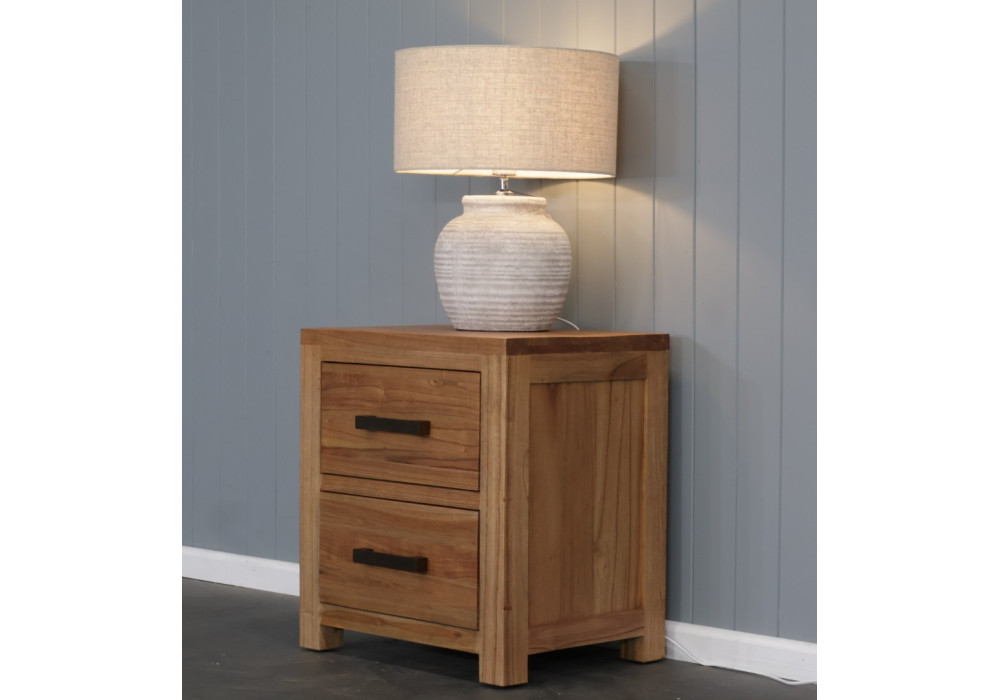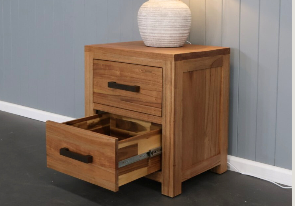 The Rozelle Bedside Chest is designed to complement the Rozelle Bed Range, offering both practicality and charm. Crafted from Mindy timber and finished in a brushed style, it enhances the natural grain of the wood while adding warmth and character. With two drawers fitted with smooth metal runners, it provides convenient storage for everyday essentials and reflects the rustic beauty of modern country living.