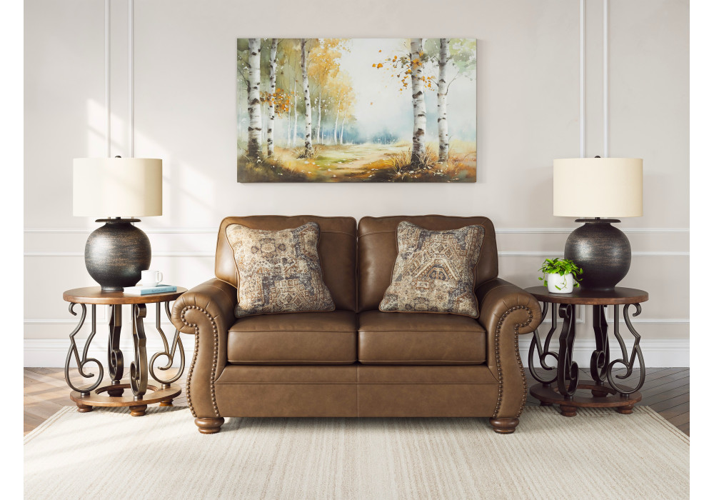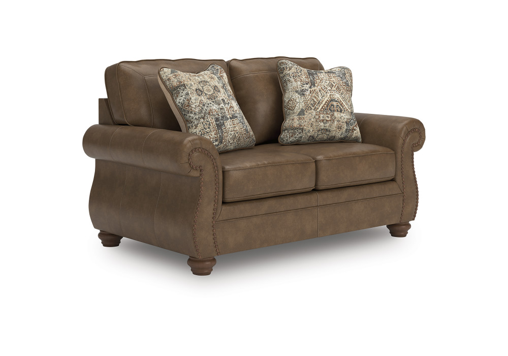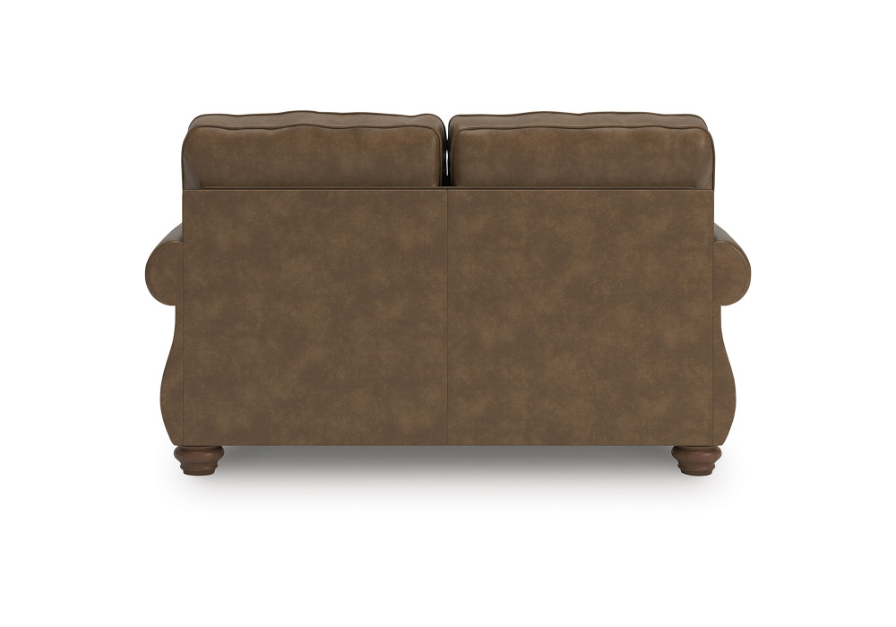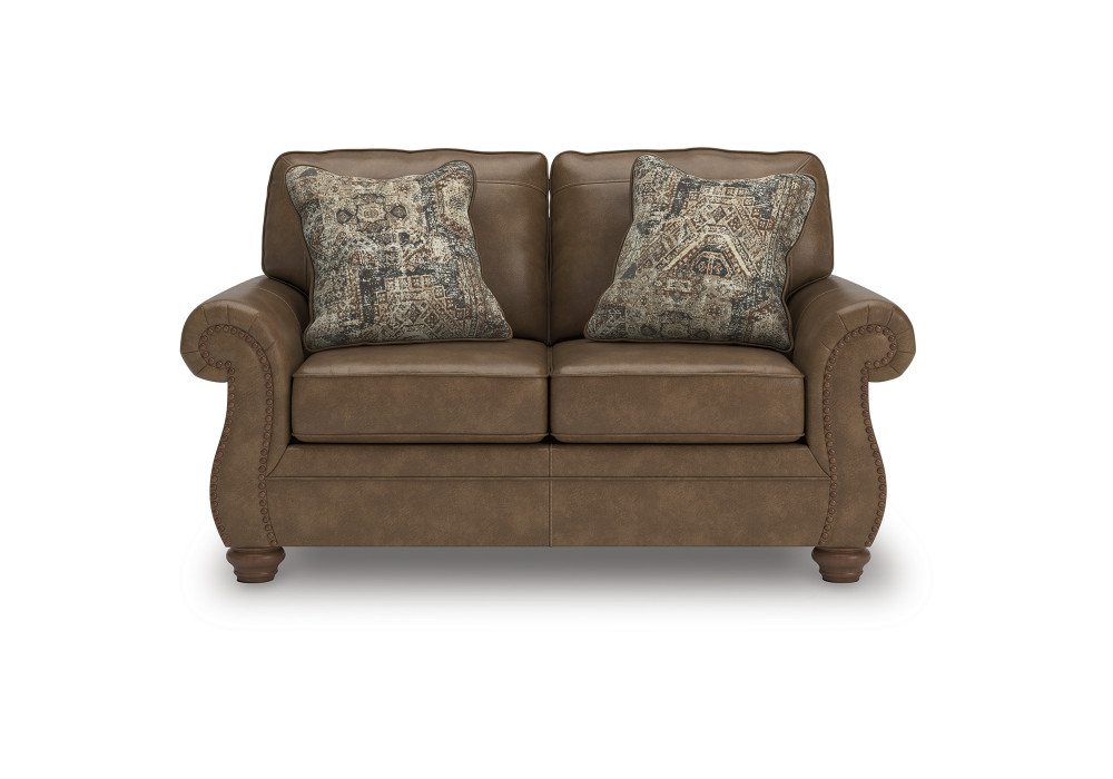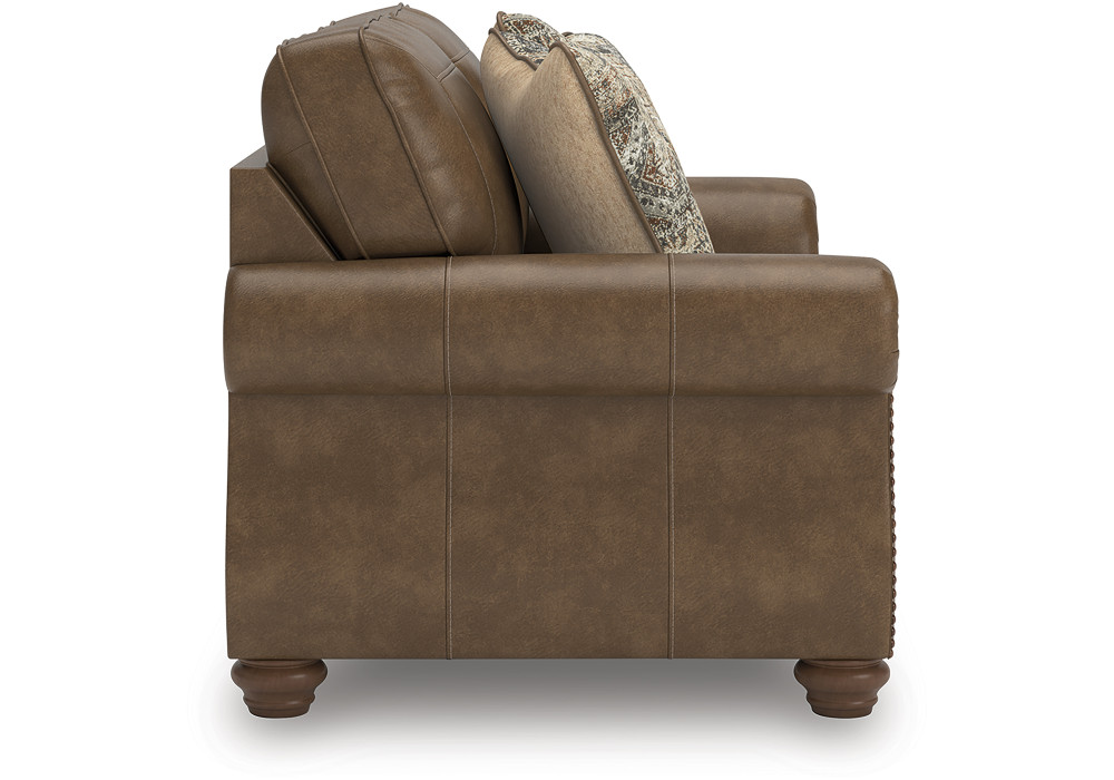 This beautifully crafted sofa in rich, faux leather upholstery combines rustic charm with modern durability while plush cushions invite you to relax and unwind. Traditional rolled arms are highlighted by classic nail head trim, adding a refined touch of sophistication. Distressed chenille accent pillows enhance the texture and visual appeal and the turned wooden legs complete the look with a nod to heritage craftsmanship.