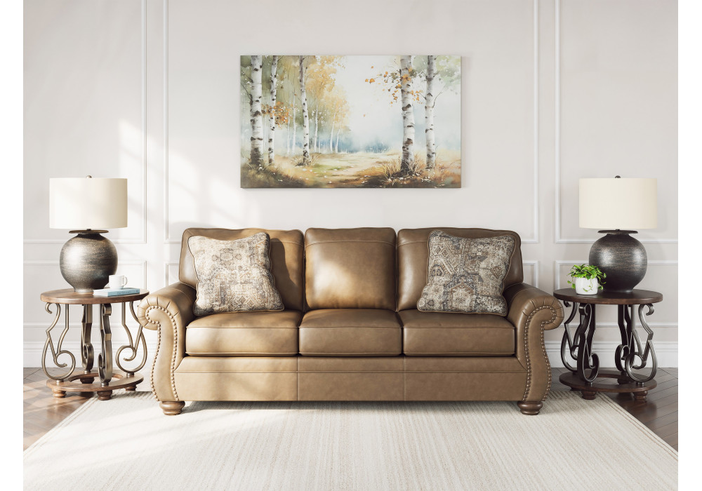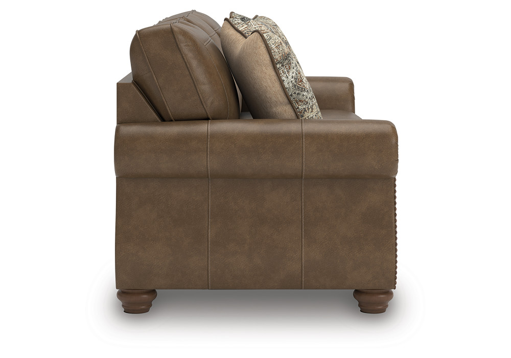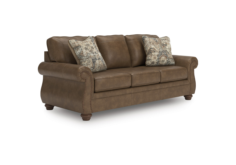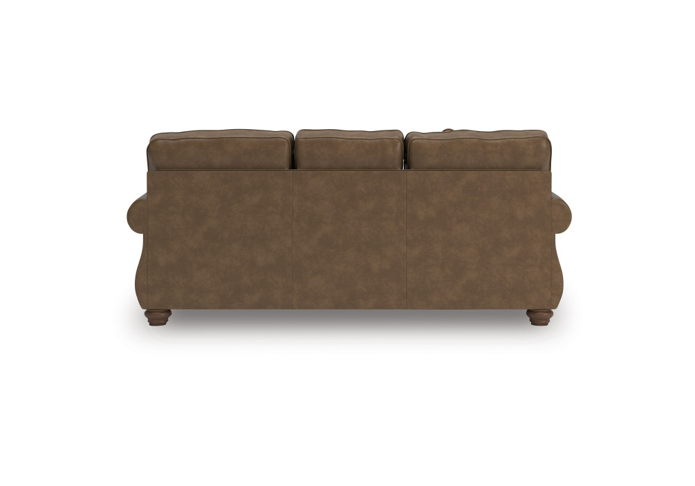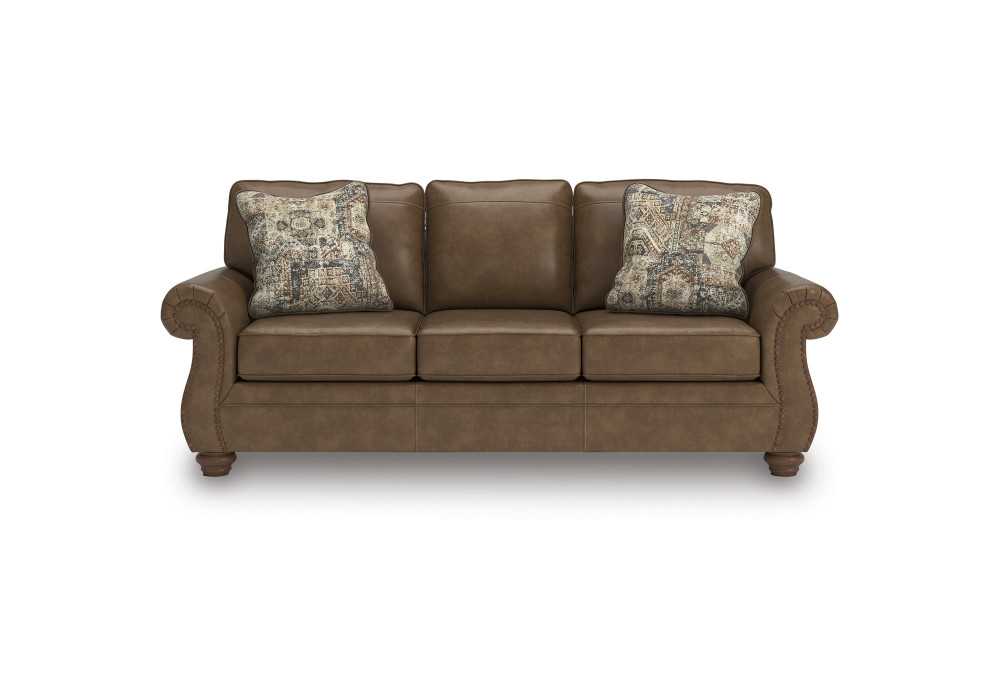 This beautifully crafted sofa in rich, faux leather upholstery combines rustic charm with modern durability while plush cushions invite you to relax and unwind. Traditional rolled arms are highlighted by classic nail head trim, adding a refined touch of sophistication. Distressed chenille accent pillows enhance the texture and visual appeal and the turned wooden legs complete the look with a nod to heritage craftsmanship.