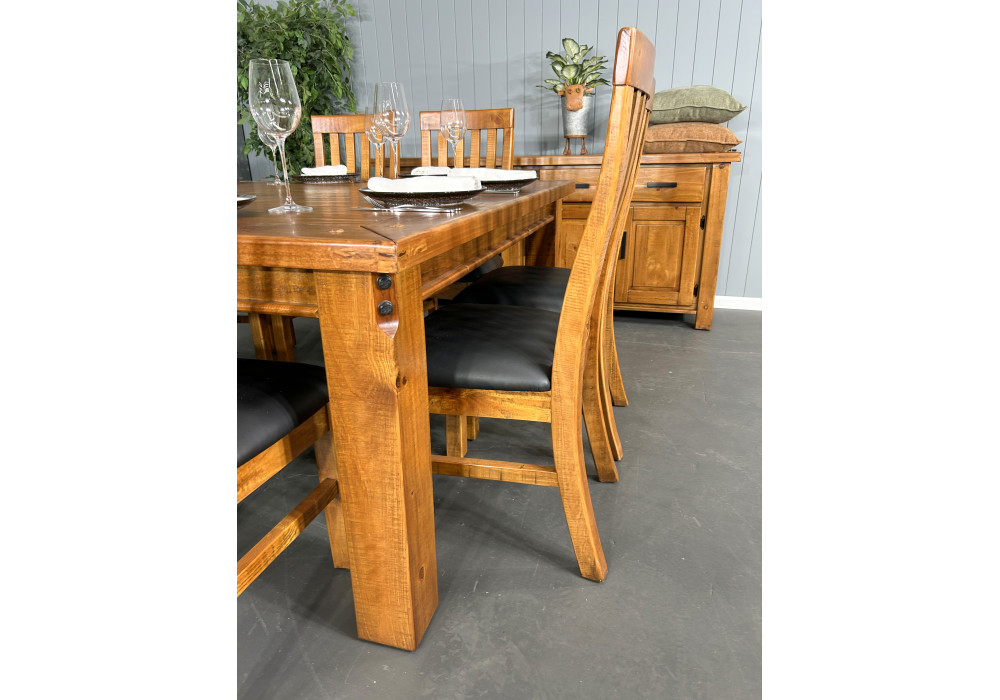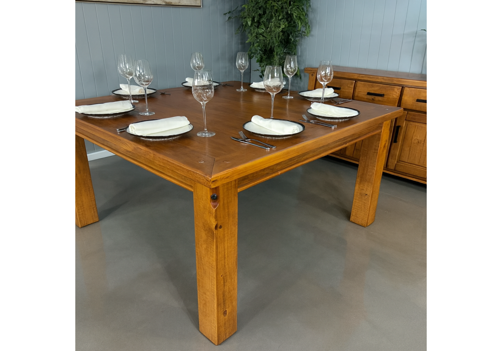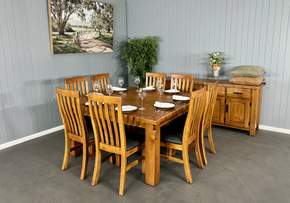 The Woolshed 9pce Dining Suite combines classic Federation design with modern comfort, making it the perfect centrepiece for larger dining spaces. At the heart of the suite is a 1500mm x 1500mm square Rustic Oak table, offering a spacious and welcoming setting for family meals and entertaining guests.