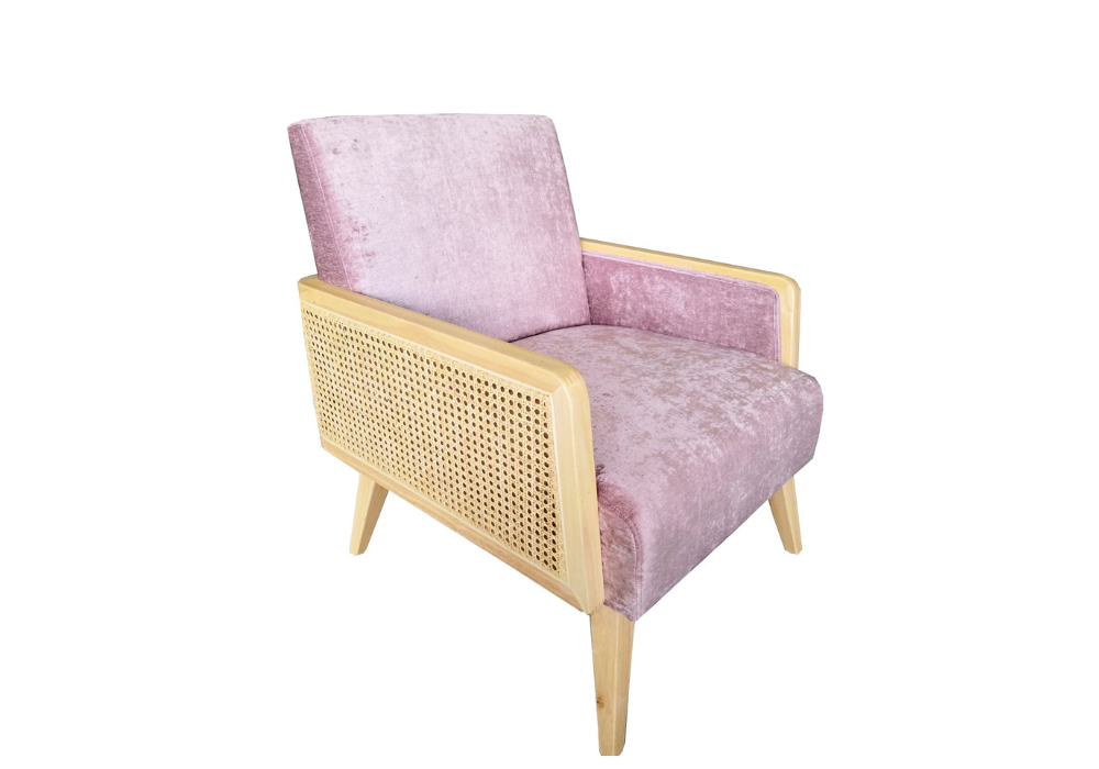The Ashford armchair with stylish print design is made from velvet fabric, natural rattan detail and timber legs and arms.