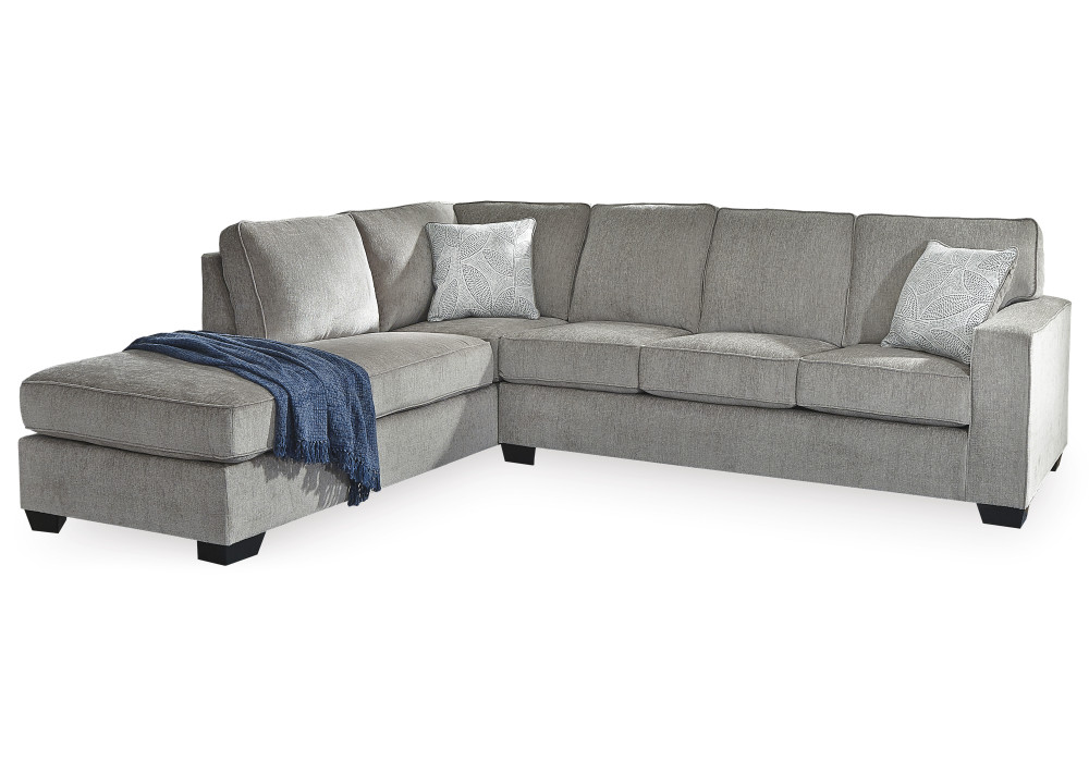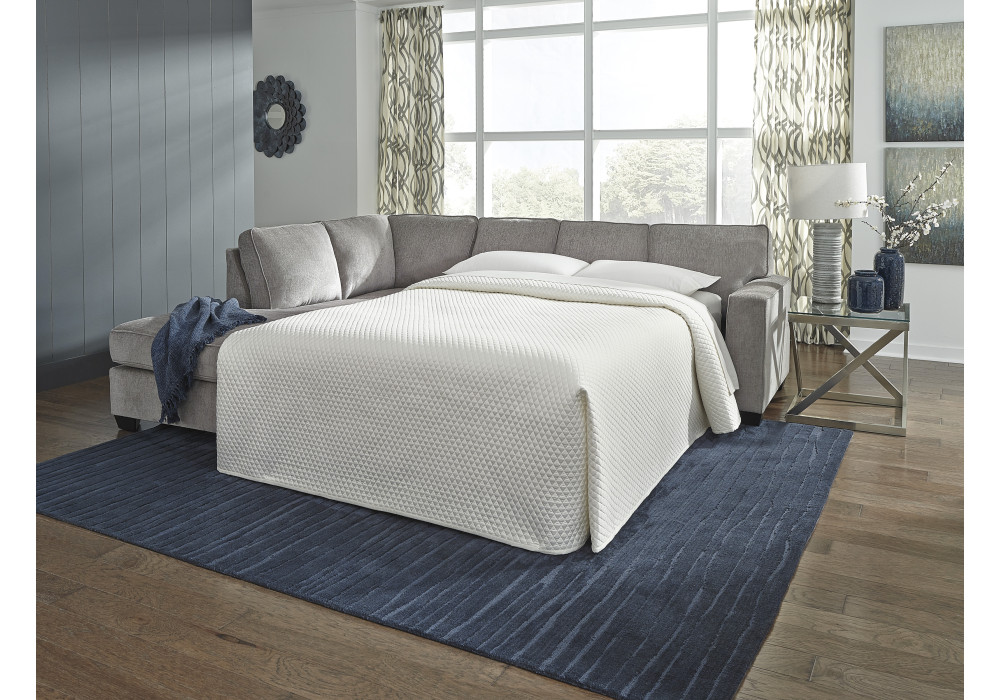 If style is the question, then this sleeper sectional is the answer. Sporting clean lines and sleek track arms, the decidedly contemporary profile is enhanced with plump cushioning and a chenille-feel upholstery, so pleasing to the touch. Sure to play well with so many color schemes, this sleeper sectional in richly neutral alloy includes a pair of understated floral pattern pillows for fashionably fresh appeal. Crafted of quality memory foam, the pull-out full mattress comfortably accommodates overnight guests.