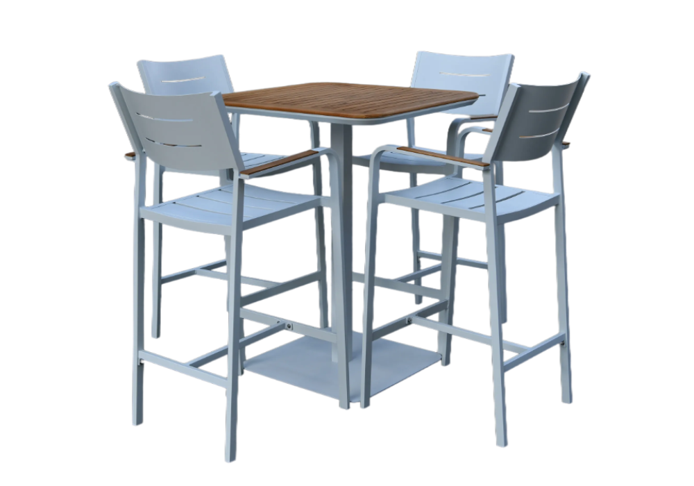 This chic bar setting brings an elevated touch to your outdoor gatherings, combining the classic appeal of teak with the sleekness of aluminum. The Corsica 800 5pce Outdoor Bar Setting is perfect for enjoying drinks with friends or hosting a casual dinner outdoors, offering both style and practicality. Its weather-resistant design ensures this set will remain a staple in your outdoor space for years to come.
