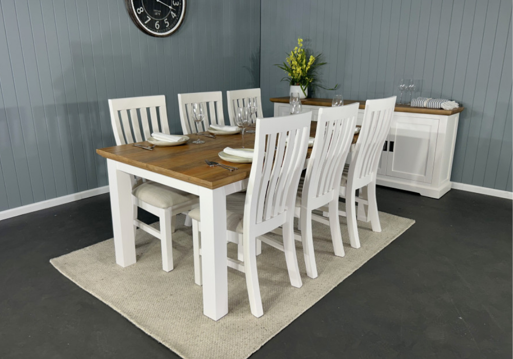 This dining suite is the perfect blend of modern simplicity and timeless elegance. Its Hamptons-inspired design effortlessly suits both contemporary and classic interiors. The spacious table accommodates six chairs comfortably, making it ideal for family meals and entertaining guests. With its natural timber tones and crisp white finishes, the Banksia 1900 Dining Suite adds warmth and sophistication to your dining area.