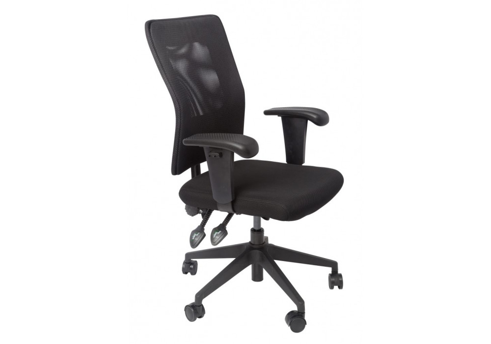 Operator chair with large mesh back, adjustable arms and 5 star base. Comes with seat and back tilt, fabric upholstered seat.