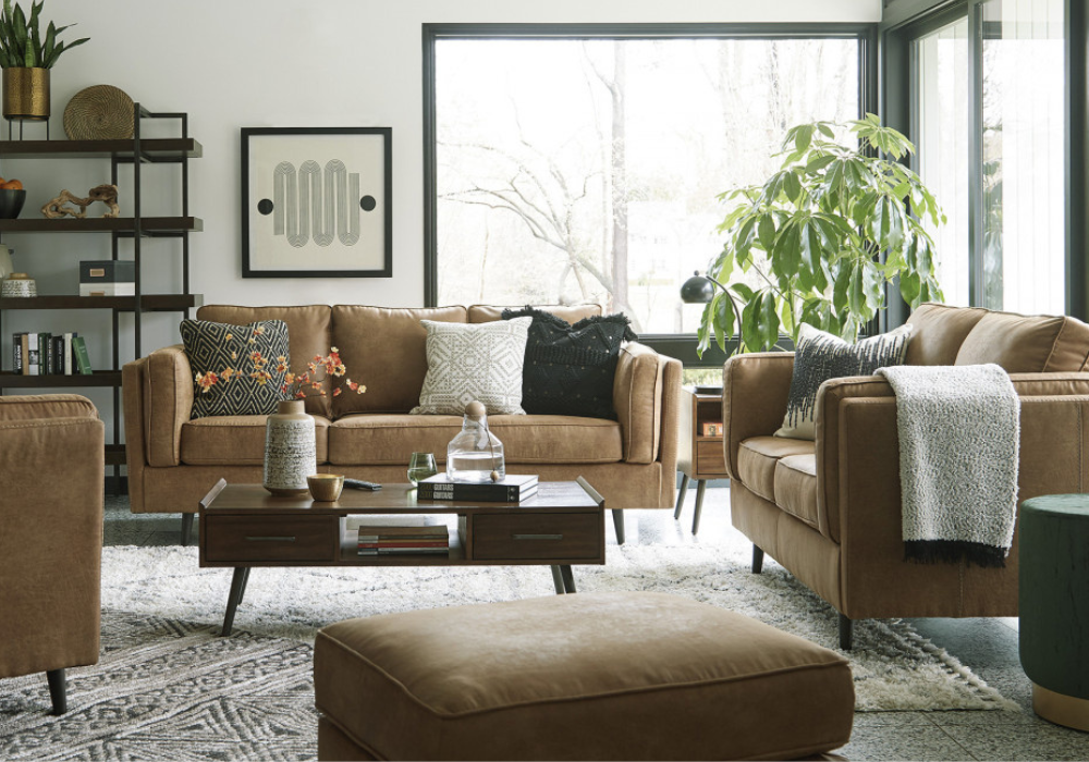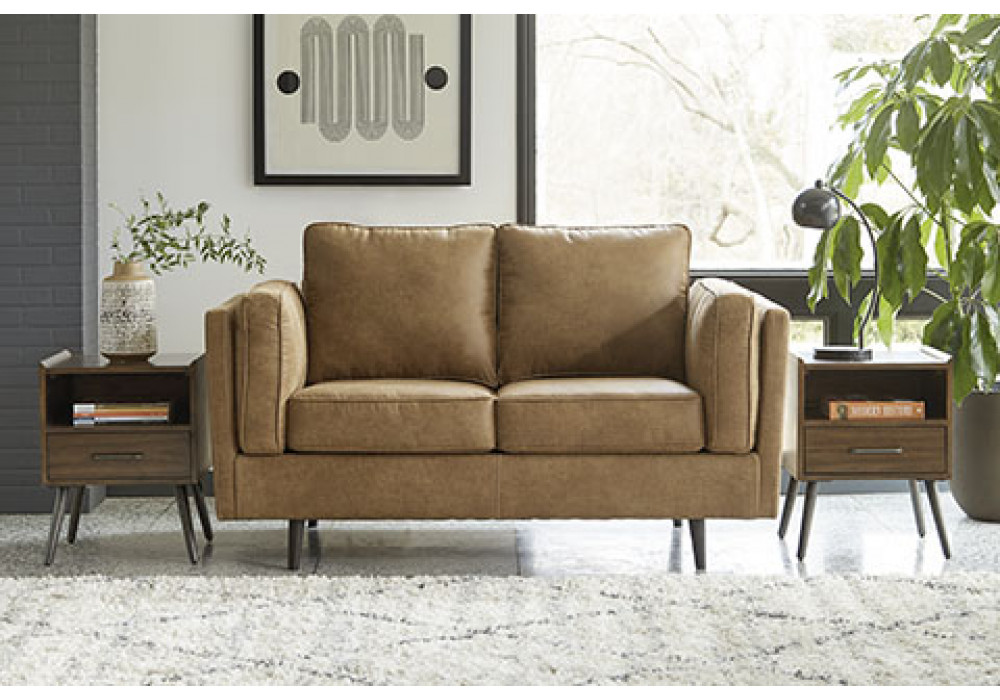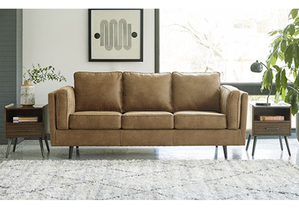 This designer sofa is mid-century revival done to perfection. Linear and minimalistic, the beautifully edited profile has all the retro elements you love, like sheltering arms, bolster pillows and tapered splayed legs. So casually cool, the caramel faux leather upholstery brings the look right into the present.