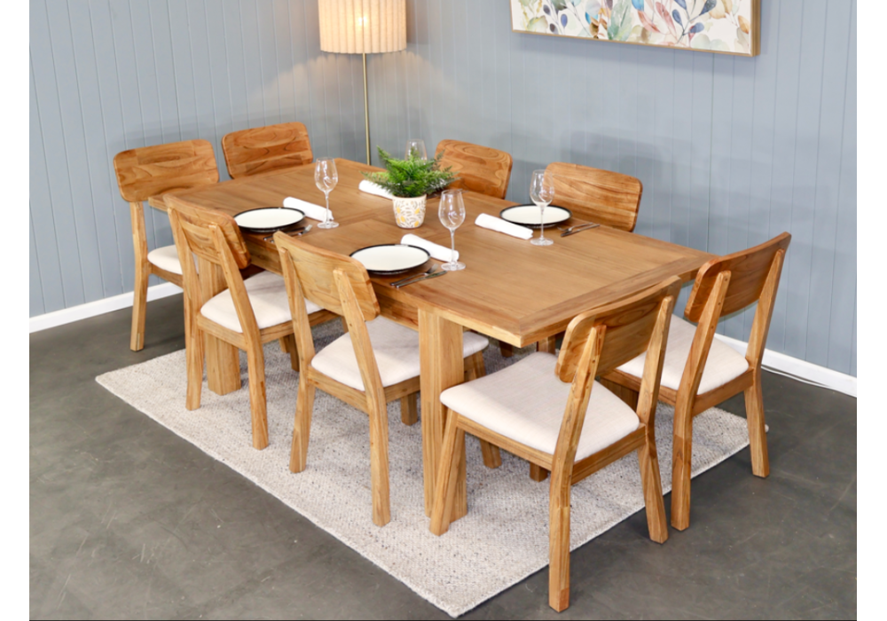 Designed for everyday living with the flair of timeless style, the Rozelle 9-piece Extension Dining Suite includes a spacious extendable dining table and eight matching chairs. Each piece is made from brushed Mindy timber, offering a cohesive look and feel. The table’s sturdy frame and classic silhouette make it ideal for family meals, homework sessions, or dinner parties. |