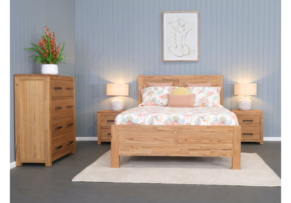 The suite includes a double bed, two matching bedside chests, and a tallboy, offering both style and practical storage. The double bed features elegant panel detailing, setting the tone for a welcoming and restful atmosphere. Each bedside chest is fitted with two drawers on smooth metal runners, ideal for keeping personal essentials close at hand. The tallboy provides four spacious drawers with ample capacity for clothing, linen, and accessories, helping you maintain an organised and stylish bedroom.