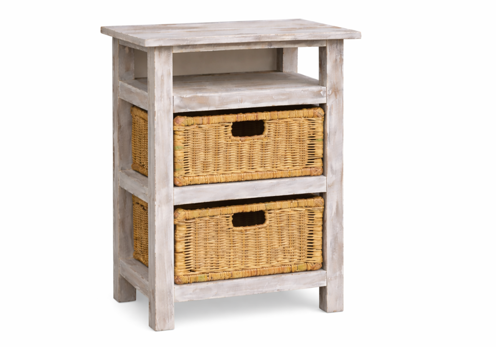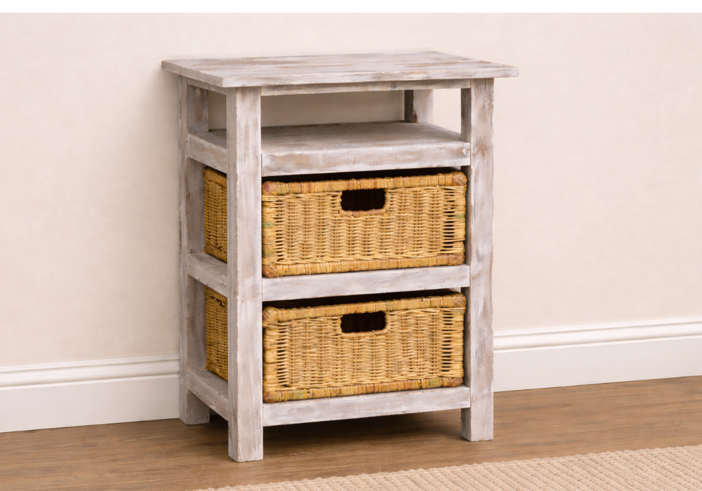 Perfect for use as a bedside table, hallway organiser, or bathroom stand, this piece blends seamlessly into Hamptons or country-style interiors. The open shelving makes it easy to display books, or décor, while the baskets keep essentials neatly tucked away.