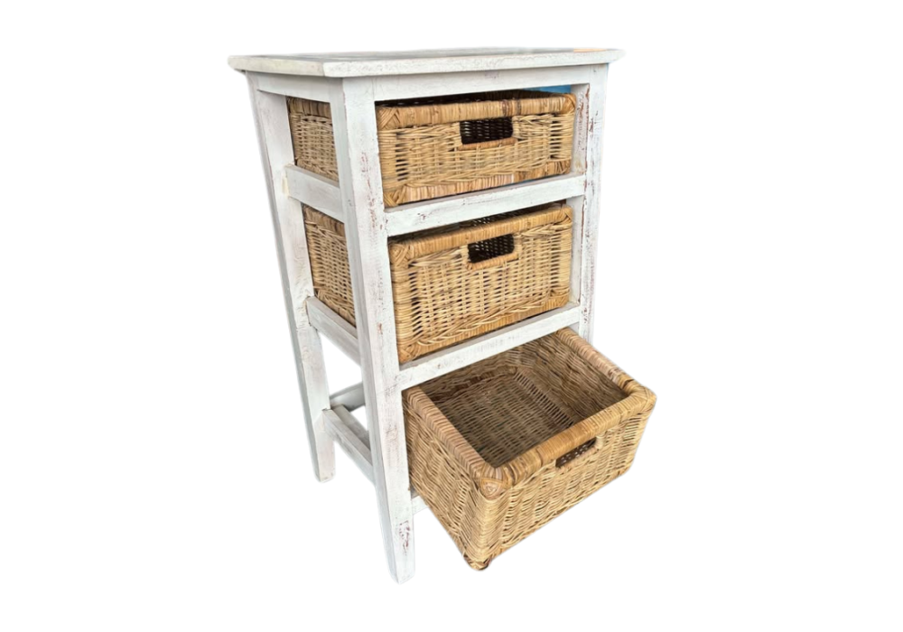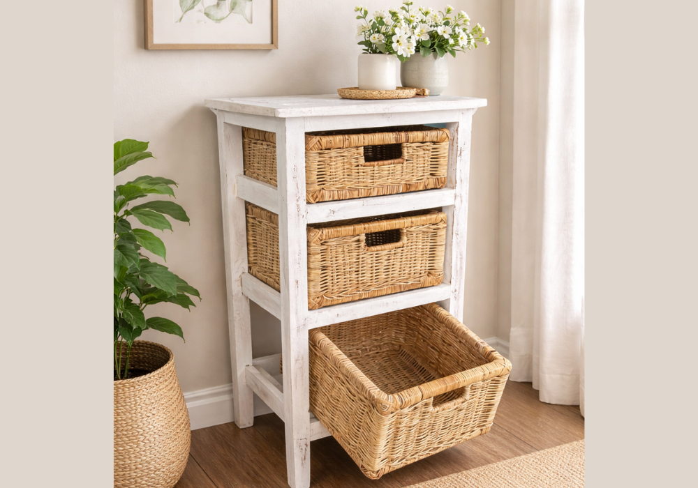 Versatile 3-Basket Storage Chest with Rattan Baskets – Whitewash Finish