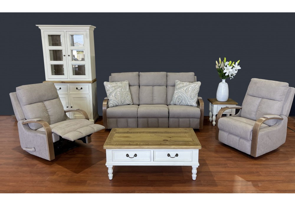 The stunning Mayford 3 Seater Reclining Suite with 2 recliner chairs is available in 5 colours - Pewter, Navy, Charcoal, Olive and Cappuccino. Seat constructed with zigzag spring system and elastic webbing. Cushions made from Polyester (90%) and nylon (10%) fabric composition. Solid timber frame made from FSC certified New Zealand Radiata Pinewood. Seat constructed with zigzag spring system.