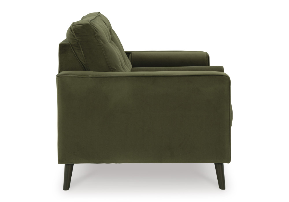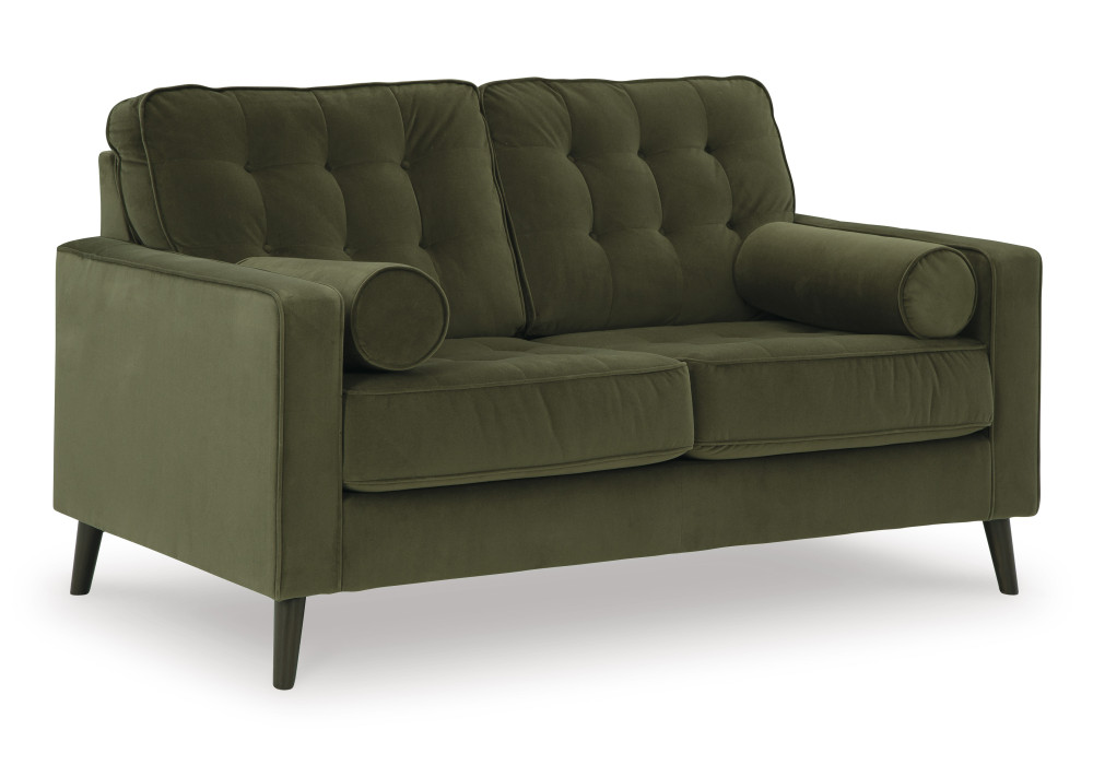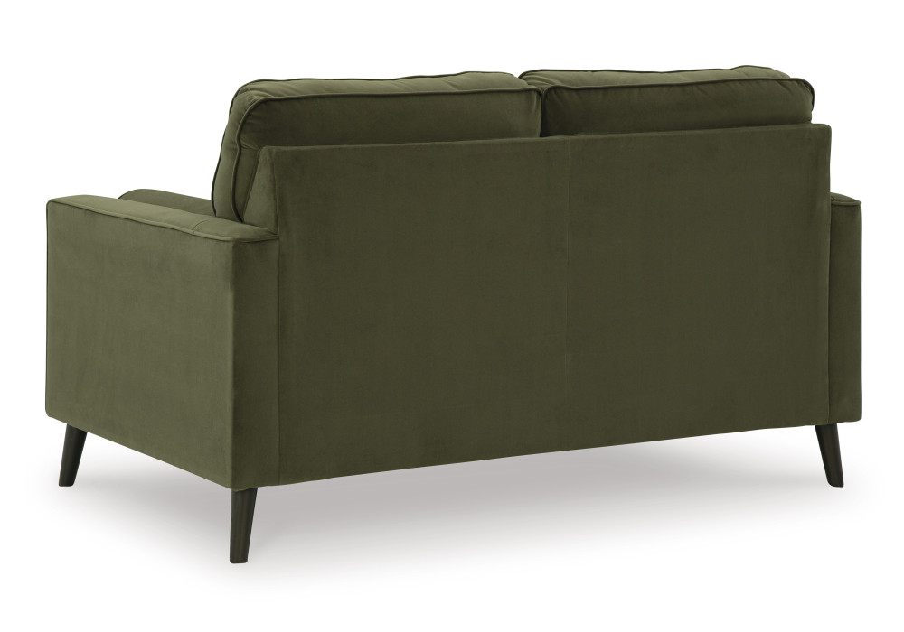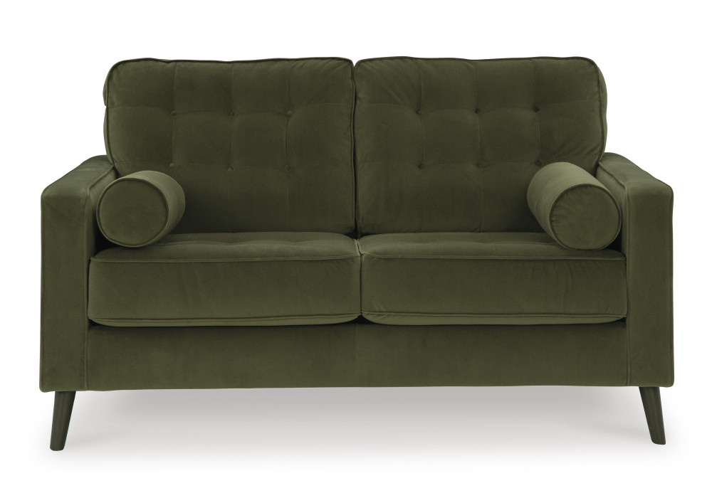 This loveseat strikes the perfect balance between elevated and eclectic. Contemporary lines and a richly hued velvet upholstery keep things chic. Design details like button tufting and splay legs add mod flair. It’s sure to keep your living room luxuriously on trend—at a price that won’t break the bank.
