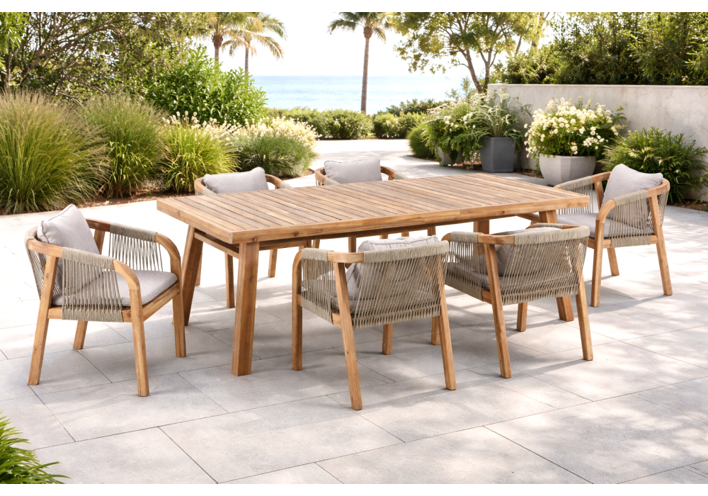 Elevate your outdoor living space with the Diablo 7-Piece Outdoor Dining Setting. This stunning ensemble seamlessly combines style and durability, offering you the perfect retreat for relaxation and gatherings.