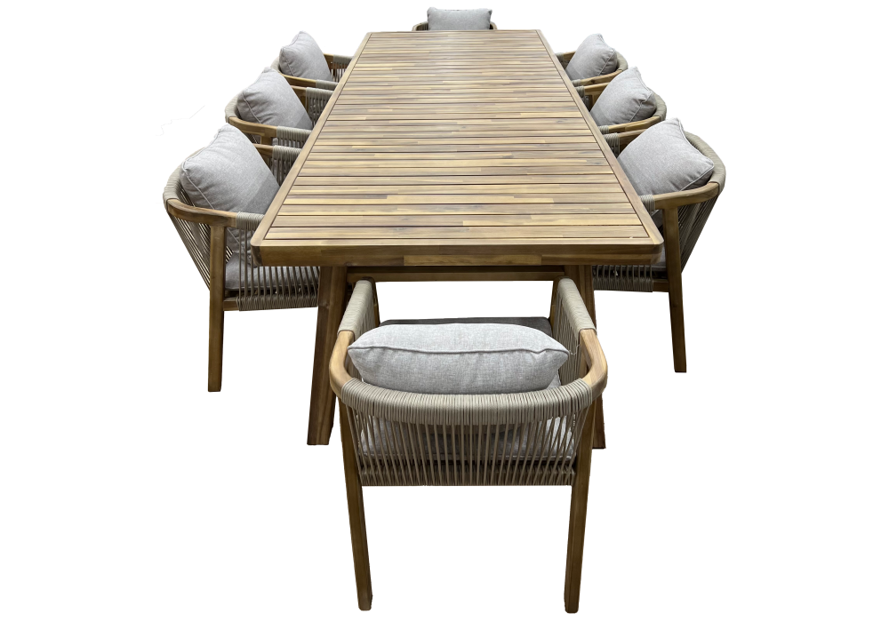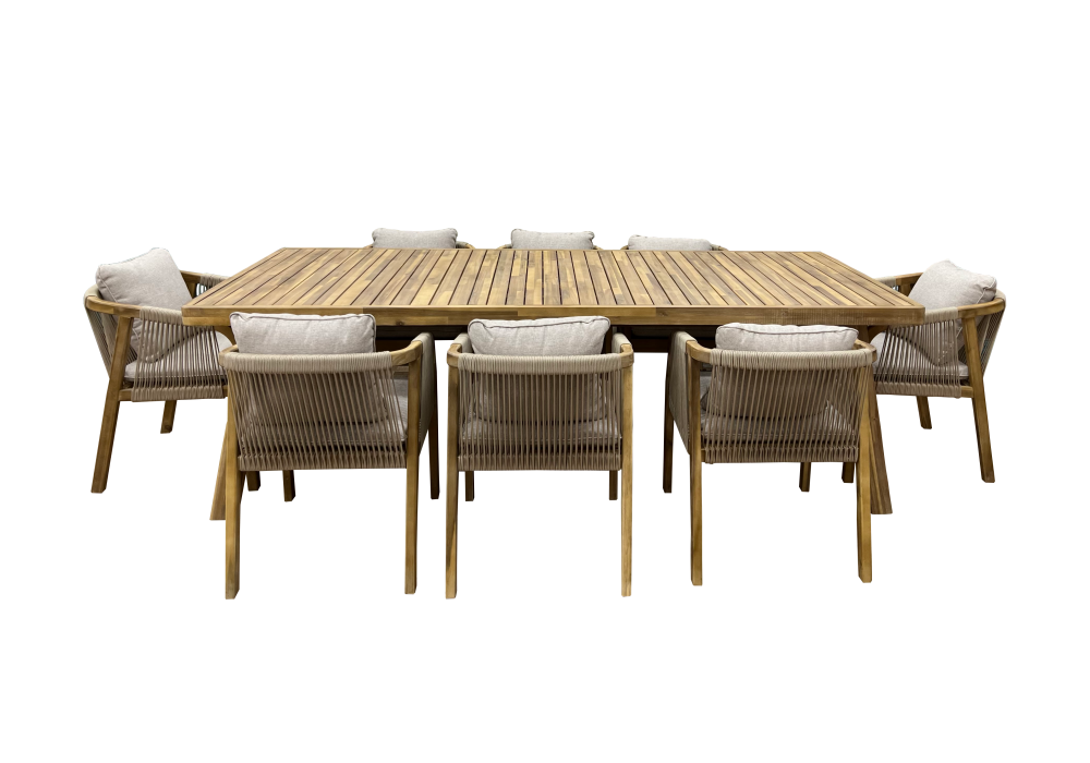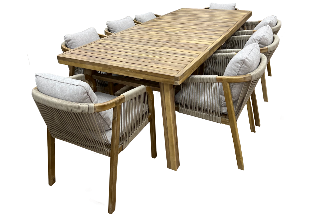 Elevate your outdoor living space with the Diablo 9-Piece Dining Suite. This stunning ensemble seamlessly combines style and durability, offering you the perfect retreat for relaxation and gatherings.