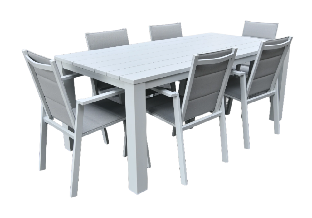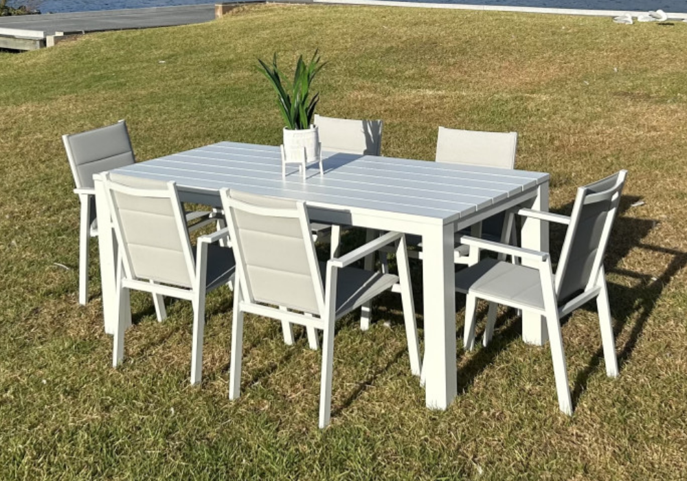 The Portsea 1800 7pce Dining Suite is the ultimate outdoor dining set, offering a combination of contemporary design, durability, and comfort. With a spacious dining table and six comfortable armchairs, this suite is perfect for gatherings, family meals, and outdoor entertaining. Designed for easy maintenance and long-lasting performance, the Portsea suite enhances your outdoor space with style.