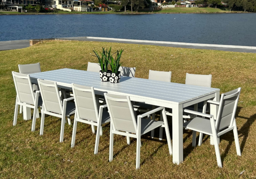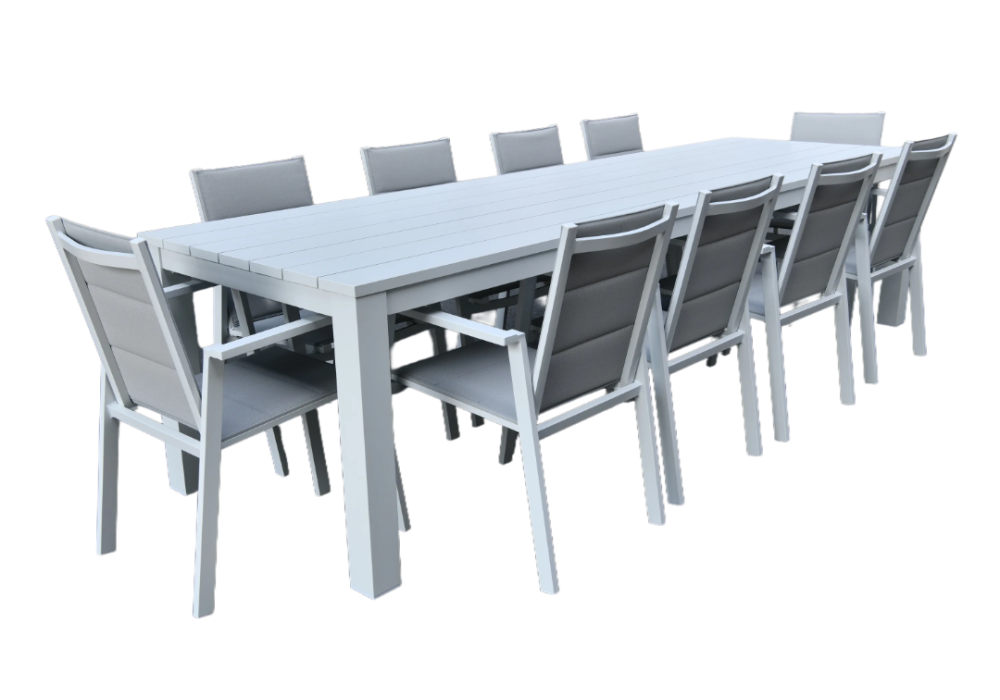 - The Portsea 3000 11pce Outdoor Dining Setting is the epitome of modern design and durability, offering an expansive dining table paired with ten comfortable chairs. Ideal for larger gatherings, family meals, or outdoor entertaining, this suite is built for long-lasting performance and minimal maintenance. Elevate your outdoor space with the contemporary appeal of the Portsea 3000.