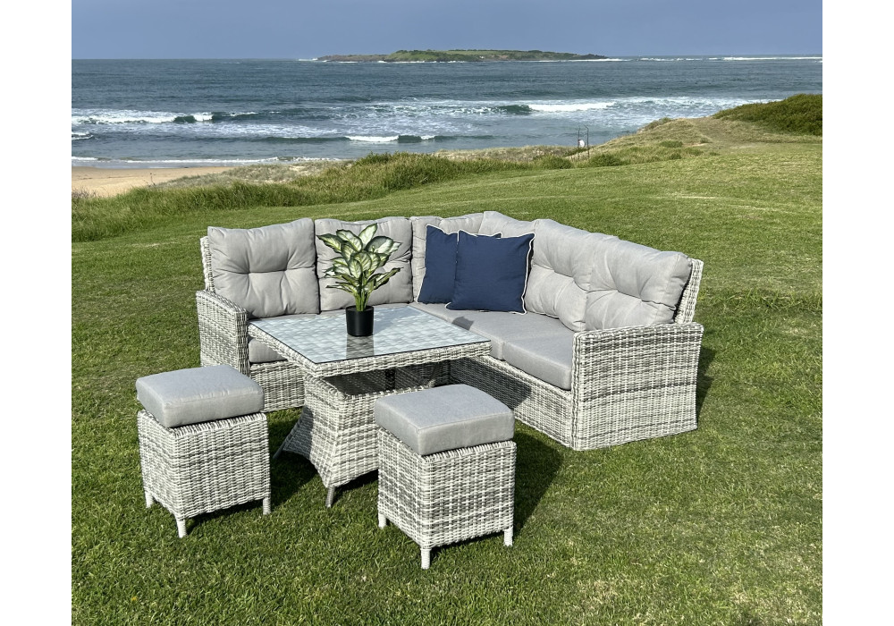 Upgrade your outdoor space with the Worcester Corner Lounge Setting, a perfect blend of durability, style, and comfort. Designed with a strong aluminum frame wrapped in half-round wicker, this set is built to withstand the elements while adding a modern touch to your patio or garden.