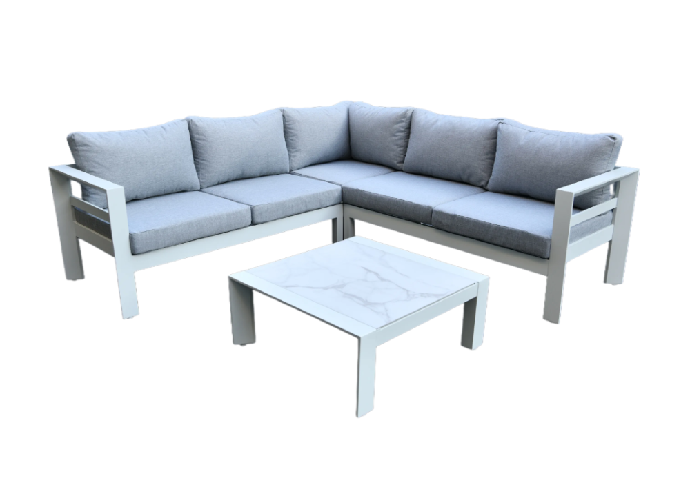 The Portsea Outdoor Corner Lounge Setting is a sophisticated and versatile outdoor furniture set, designed to offer both style and comfort. Perfect for larger outdoor areas or patios, corner lounge set includes a 3-seat sofa, a 2-seat sofa, and a coffee table. The set features a modern design with a durable aluminum frame, light grey cushions, and a sleek off-white marble print tabletop, making it an ideal choice for those looking to elevate their outdoor living space.