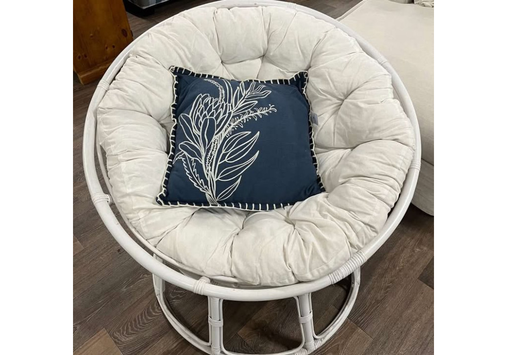 A lavish, over-padded cushion filled with cotton wadding paired with the white painted, cane base. Frame made from rattan timber. Cushion inset made with blacu fabric and kapok insert. 100% polyester fabric cushion cover.