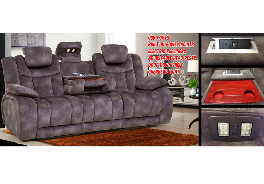 The exceptional comfort and quality of the Parker Power 3 Seater Recliner provides the ultimate experience in luxury and satisfaction. This essential home theatre suite comes with all the bells and whistles including USB ports, built-in power points, electric recliners, adjustable head rests, lights and a drop down shelf. Constructed using a solid timber frame with pocket spring system and foam seating.