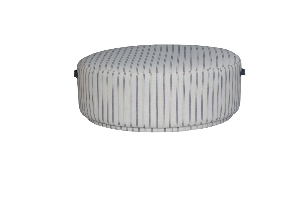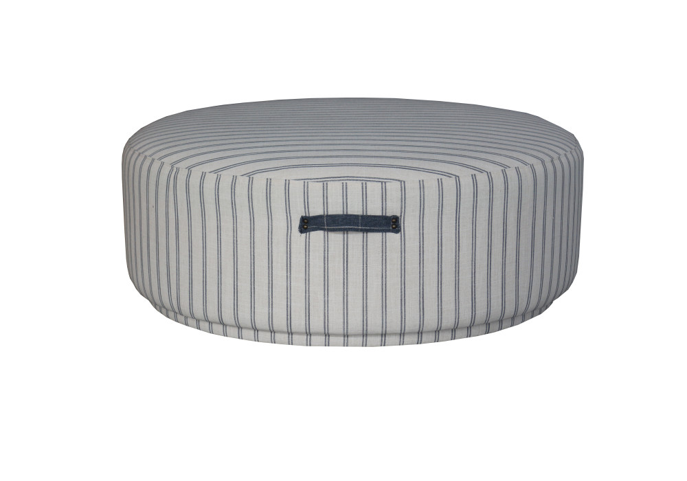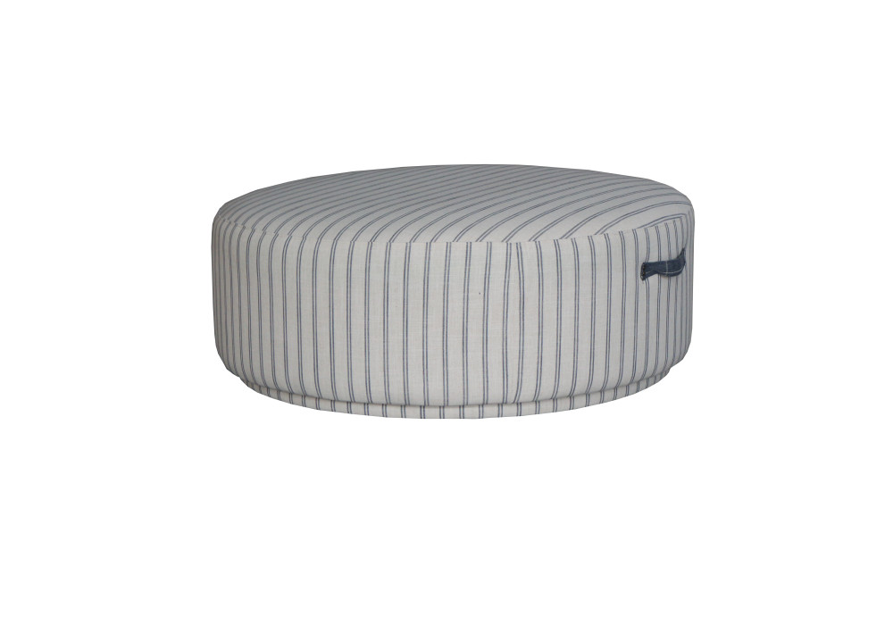 The Sunny Ottoman features sleek blue lines on a white base, giving it a plush European aesthetic and Hampton's style.