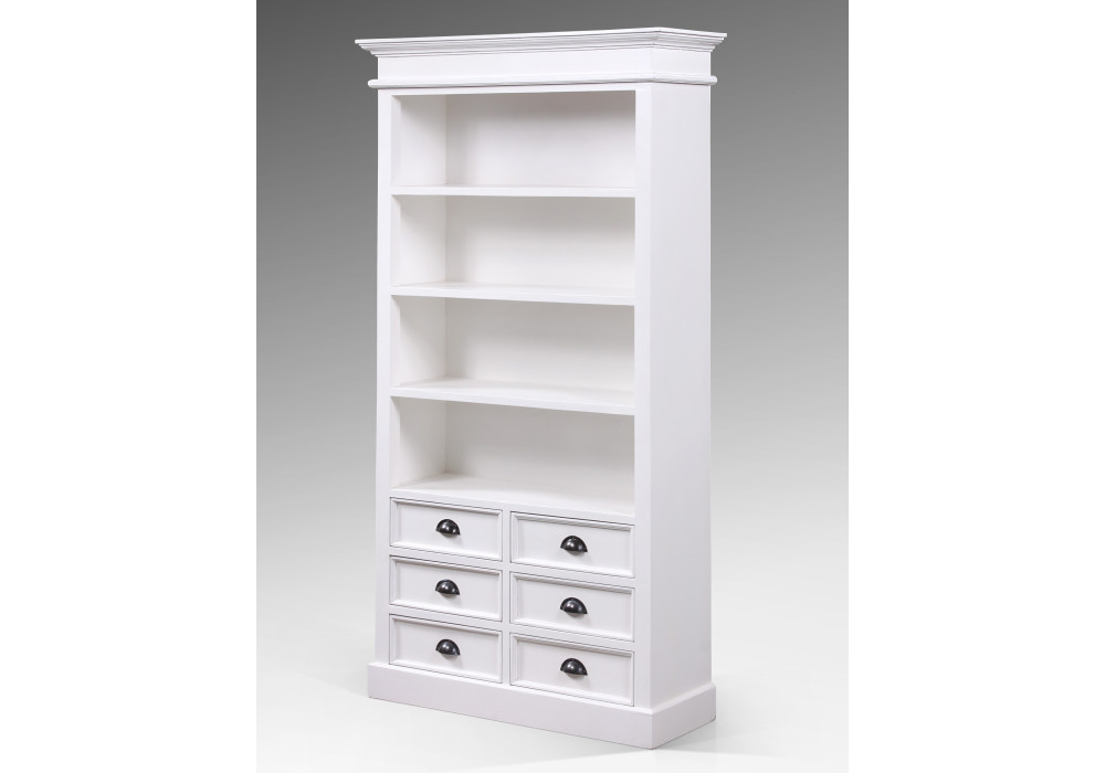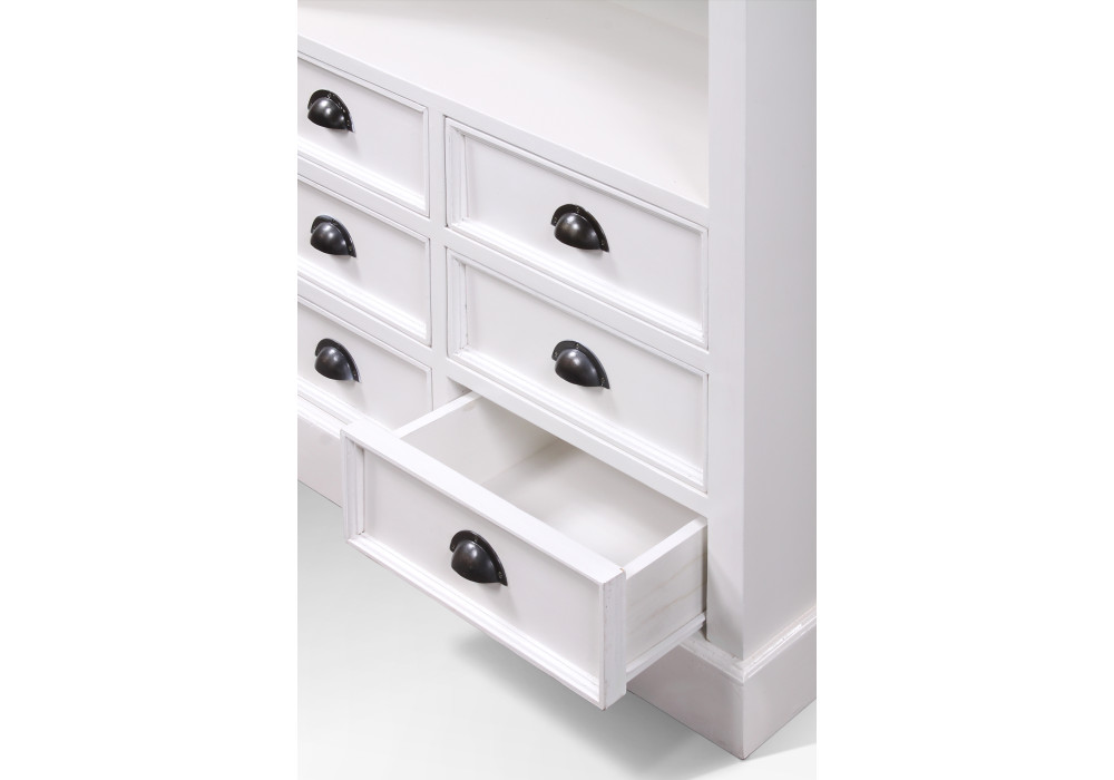 This spacious bookcase offers 6 drawers and 4 open shelves for ample storage for your books, decorative pieces, and collectibles. Its clean lines and sturdy construction ensure durability while providing a chic and organized solution to your storage needs.