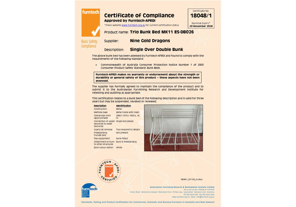 Built with a sturdy metal frame and mesh mattress base, the Trio Bunk Bed is designed to meet Australian bunk bed safety standards, giving you peace of mind while delivering everyday practicality.