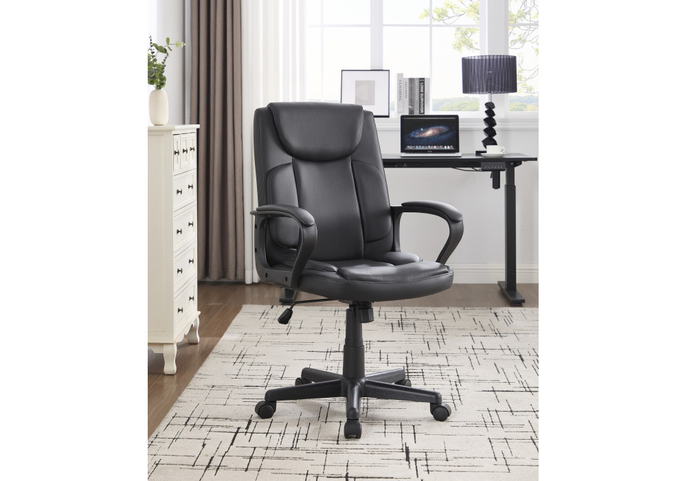 Designed with user comfort in mind, the Watford Office Chair features padded armrests, adjustable seat height, and a sturdy nylon base with smooth-rolling castors for easy movement across most floor surfaces.