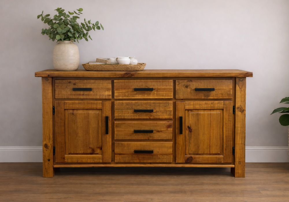 The Woolshed 1490 Buffet is ideal for storing dinnerware, linens, and other essentials with its generous storage compartments. The buffet features solid metal handles and runners, ensuring smooth operation, while adding a subtle industrial touch to its rustic design. It's a perfect addition to any dining or living space, offering both functionality and style.
