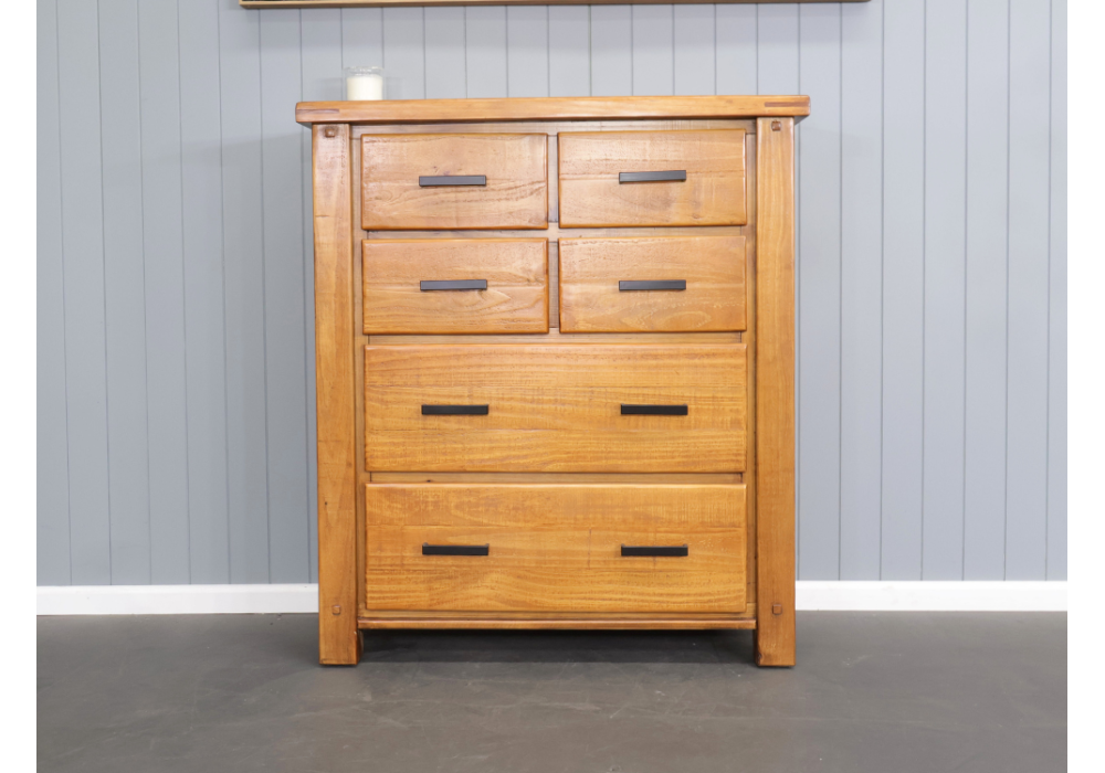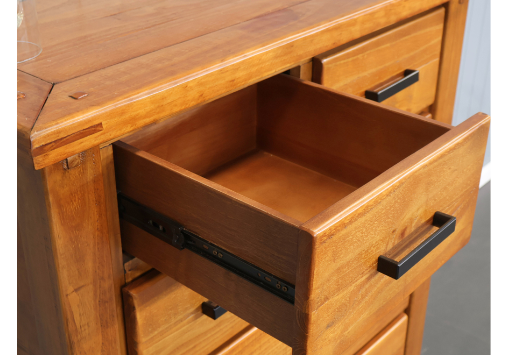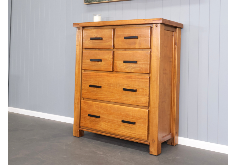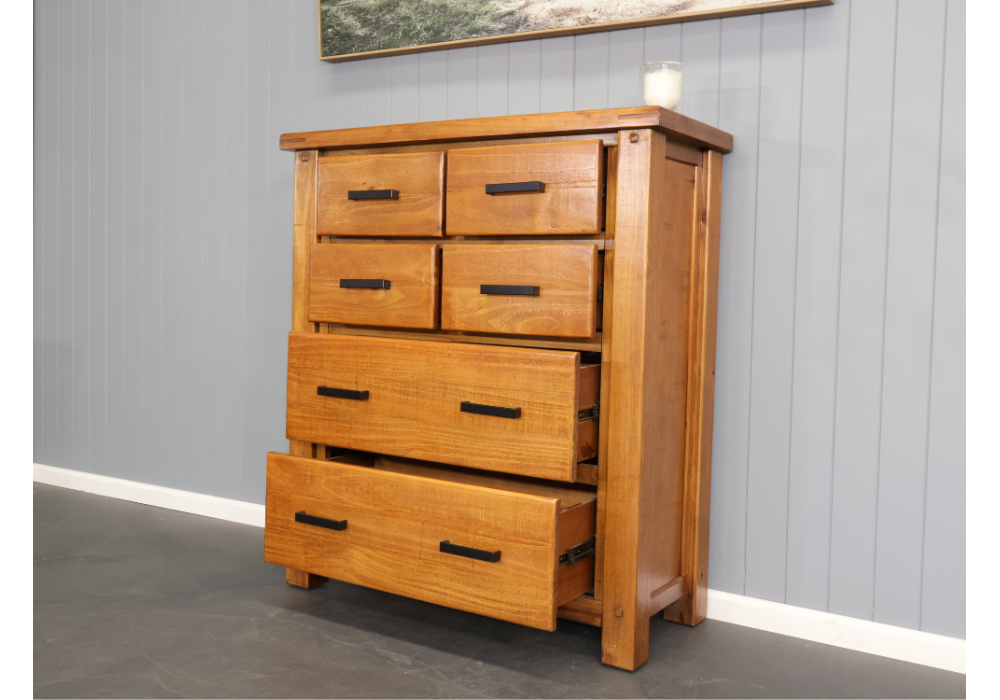 The Woolshed Tallboy is a federation-style bedroom piece designed to provide both timeless character and practical storage. Crafted from solid pine timber in a Rustic Oak colour with a durable lacquer finish, it highlights the natural warmth of the wood while ensuring long-lasting durability. With six spacious drawers, this tallboy offers an elegant and functional solution for organising clothing and accessories.